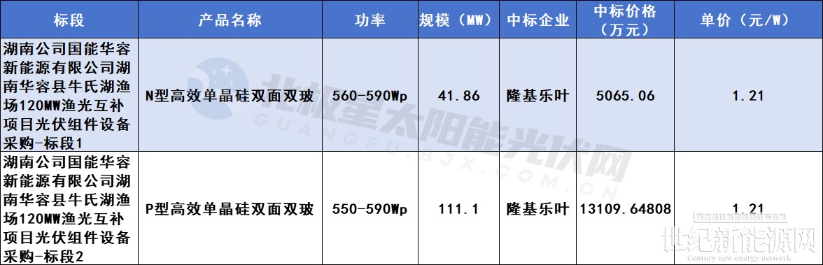 11月6日,湖南华容县牛氏湖渔场120MW渔光互补项目光伏组件设备采购招标中标结果公示,中标企业为隆基乐叶。