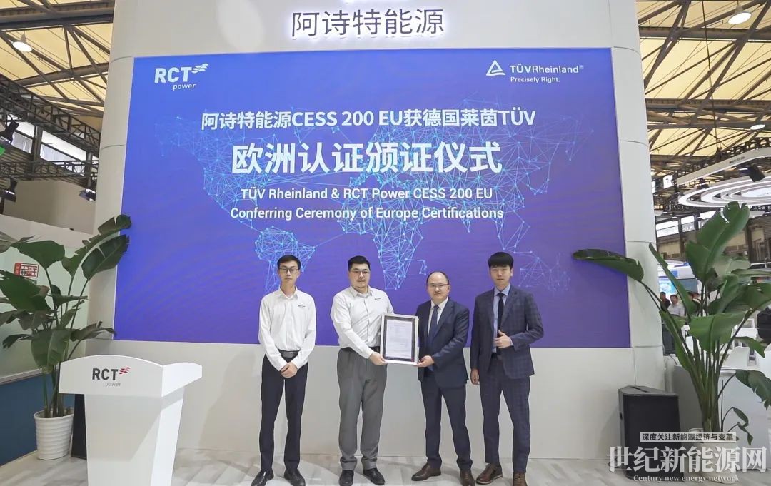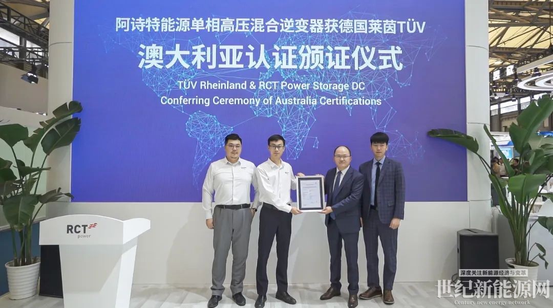 获得权威认证是产品进入大规模市场应用的“通行证”。本次展会现场,德国莱茵TÜV集团(以下简称:德国莱茵TÜV)为阿诗特能源颁发了CESS 200 EU(L200)产品的欧洲认证证书和单相高压混合逆变器(澳洲机)的澳大利亚认证证书。