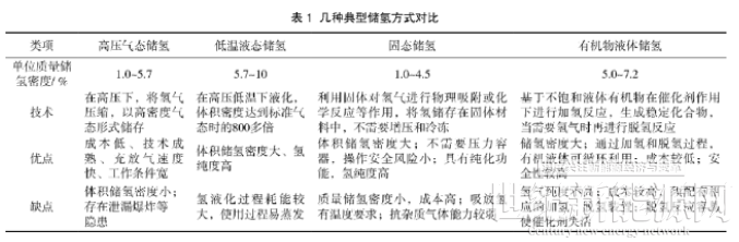 储氢方式一般分为化学储氢(有机液体储氢)、物理储氢、吸附(固态)储氢。物理储氢包括高压气态储氢和液态储氢。几种储氢方式的对比可见表1[4]。