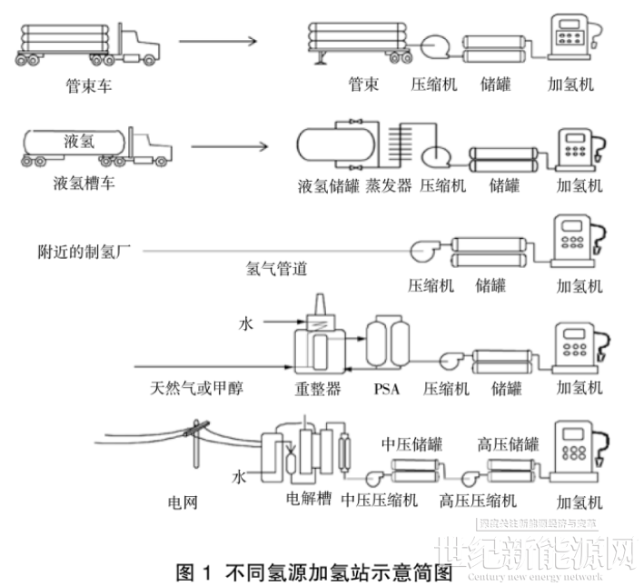 不同氢源的加氢站示意简图可见图1。目前加氢站一般采用长管拖车外供、高压储存气氢,工艺流程如图2所示。