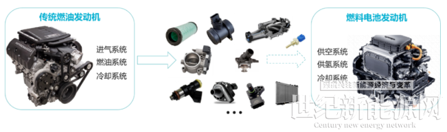 传统燃油发动机、燃料电池发动机系统架构对比