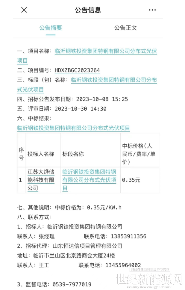 近日,笔者通过招标平台获悉,山东恒达信项目管理有限公司代理招标的“临沂钢铁投资集团特钢有限公司分布式光伏”项目,2023年10月30日通过公开评审,于次日2023年10月31日公布中标单位为“江苏大烨储能科技有限公司”,通过平台公布数据来看,本次中标价格仅为0.35元/KW.h。