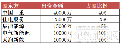 公司股权结构:中国一重占股40%、出资40,000万元,佳电股份占股25%、出资25,000万元,辰能能源占股15%、出资15,000万元,电气新能源占股10%、出资10,000万元,天润新能占股10%、出资10,000万元。