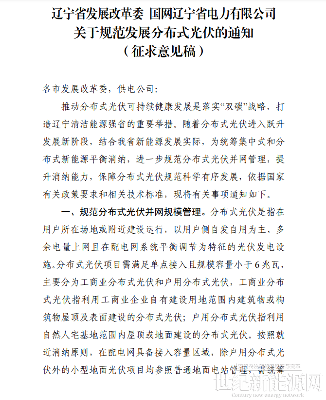 2023年11月28日,辽宁省发展改革委对《关于规范发展分布式光伏的通知(征求意见稿)》 公开征求意见的公告。公告指出,为确保我省分布式光伏科学、规范、有序发展,进一步推动新能源高质量跃升,我委会同省电力公司起草了《关于规范发展分布式光伏的通知(征求意见稿)》,现面向社会公开征求意见。此次征求意见时间为2023年11月28日至2023年12月27日,如有意见建议,请通过电子邮件方式反馈我委。
