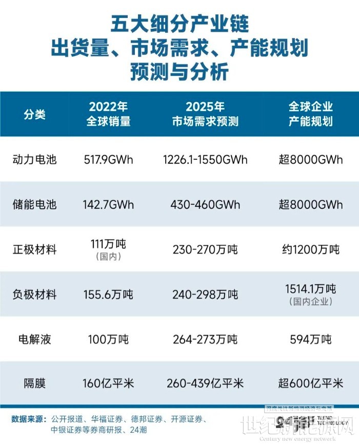 首先看24潮产业研究院(TTIR)统计的一组数据:截止目前,在动力电池、储能电池、正极材料、负极材料、电解液与锂电隔膜这6大核心赛道上,已知的企业产能规划均远超2025年第三方研究机构对市场需求的预测上限,未来三年内出现严重产能过剩似乎已经不可避免。