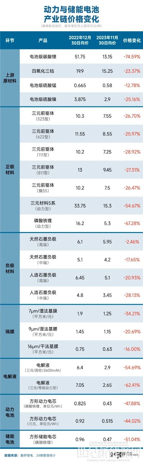据24潮团队及鑫椤锂电整理统计,2023年前11个月,动力与储能电池核心产业链价格全线暴跌,其中动力电池跌幅超44%,方形储能电芯(磷酸铁锂)降幅超51%,另外部分正极材料与电解液产品价格降幅超60%,电池级碳酸锂价格跌幅更是超过74%。
