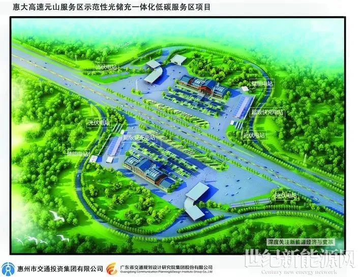 惠大高速公路元山服务区两个片区分别建设一座超级快充电站,每个电站配置480kW超级充电堆2套,配备12个快充及超充充电车位,配建一座800KVA箱式变电站和2套储能柜。该项目建设的光储充一体化电站(网)不仅可以降低能耗水平,还可以为服务区提供绿色清洁能源,具有良好的环保效益、社会效益、经济效益。