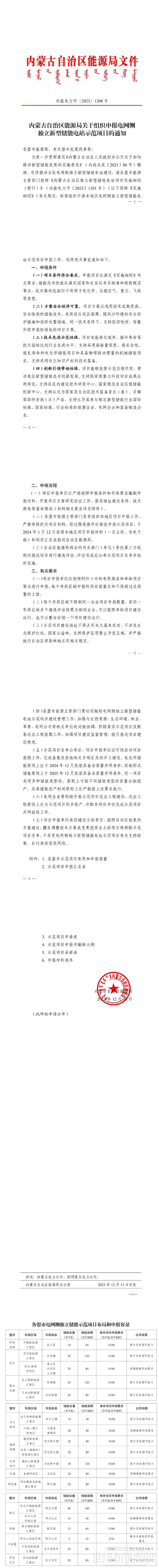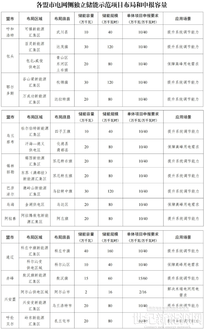 12月11日,内蒙古自治区能源局印发关于组织申报电网侧独立新型储能电站示范项目的通知(以下简称“通知”)。共涉及12个盟市,申报总容量为3.57GW/14.36GWh,除阿尔山供电区域为解决末端电网用电需求储能时长8h外,其他地区储能时长均为4h。