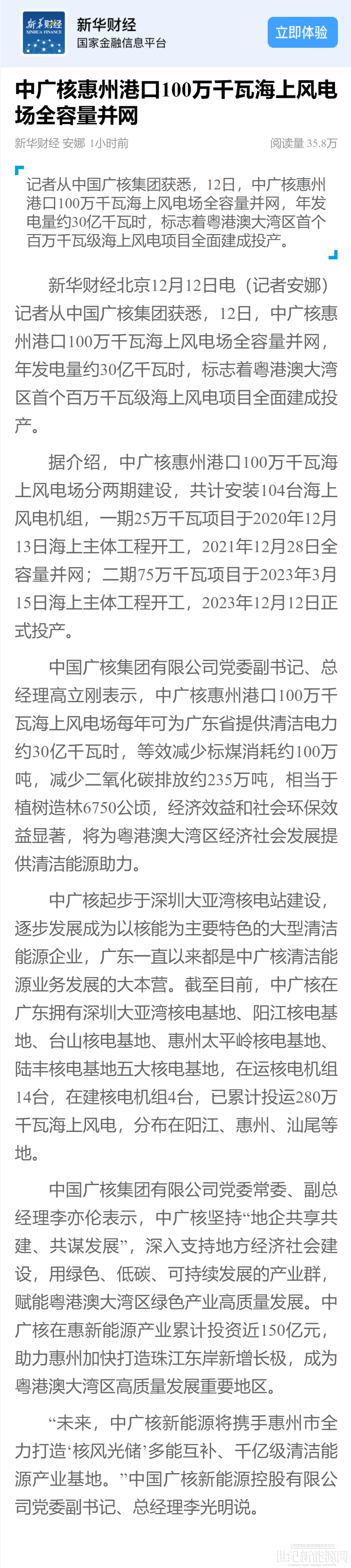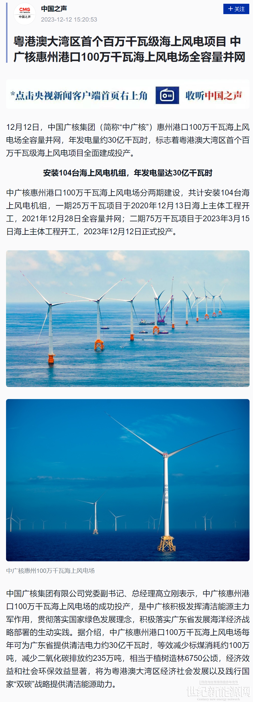 12月12日,中国广核集团惠州港口100万千瓦海上风电场全容量并网,年发电量约30亿千瓦时,标志着粤港澳大湾区首个百万千瓦级海上风电项目全面建成投产。