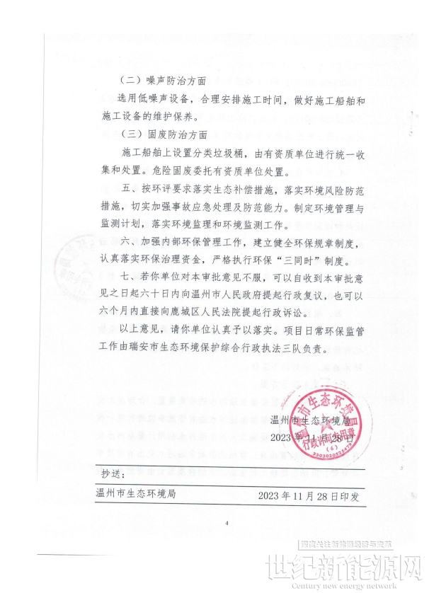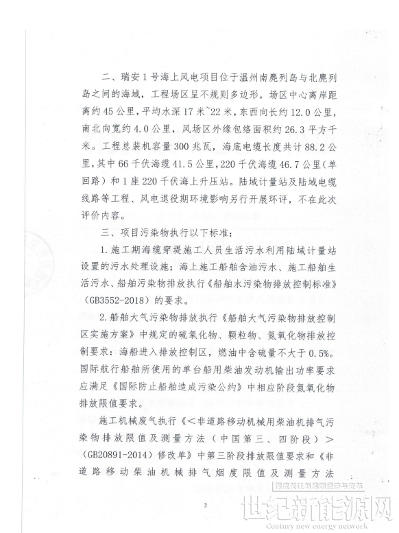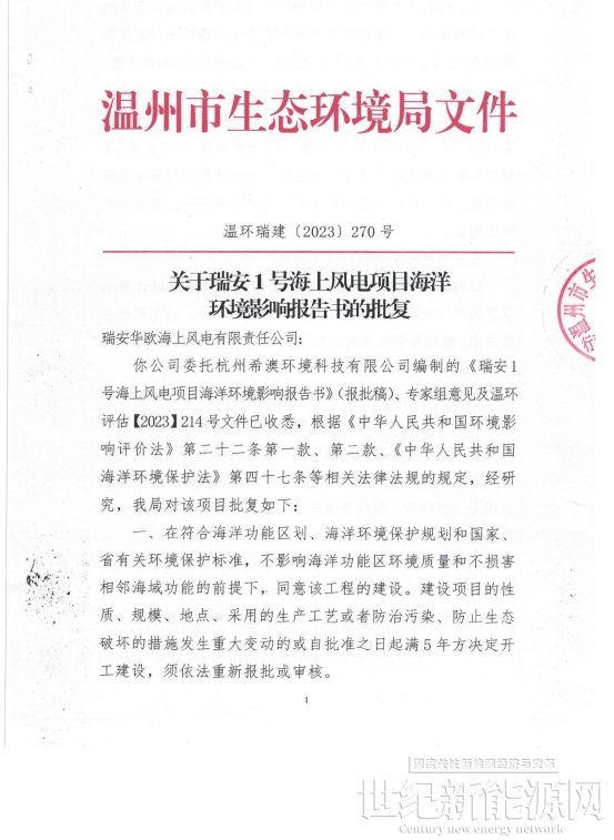 温州市生态环境局发布《关于瑞安1号海上风电项目海洋环境影响报告书的批复》,《批复》显示,在符合海洋功能区划、海洋环境保护规划和国家、省有关环境保护标准,不影响海洋功能区环境质量和不损害相邻海域功能的前提下,同意该工程的建设。