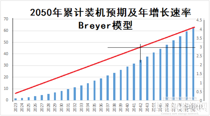 按照Breyer团队的研究,到2050年,太阳能可能满足全球电力需求的 75%,占一次能源供应总量的 69%,全球装机容量约为63.38 TW。也就是说,未来27年全球将新增光伏装机61.78GW,年均新增2.29GW。如果以2023年的0.4TW为基数,每年线性增长0.1349 TW可以实现Breyer的2050目标。但年新增3TW将发生在2042年!