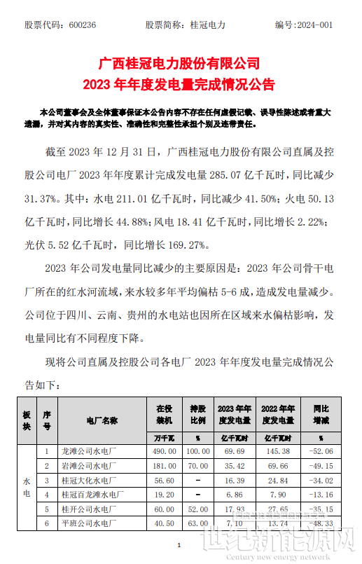 近日,桂冠电力发布2023年年度发电量完成情况公告。