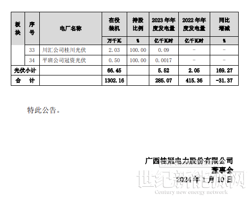 根据公告显示,截至2023年12月31日,广西桂冠电力股份有限公司直属及控股公司电厂2023年年度累计完成发电量285.07亿千瓦时,同比减少31.37%。其中:水电211.01亿千瓦时,同比减少41.50%;火电50.13亿千瓦时,同比增长44.88%;风电18.41亿千瓦时,同比增长2.22%; 光伏5.52亿千瓦时,同比增长169.27%。