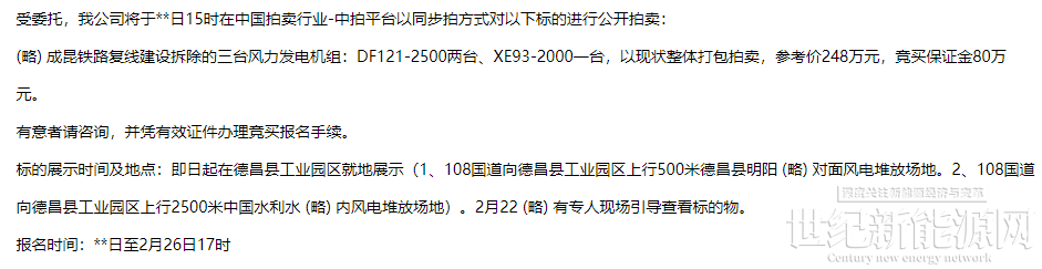 1月23日,德昌风电开发有限公司成昆铁路复线建设拆除的三台风力发电机组:DF121-2500两台、XE93-2000一台,以现状整体打包拍卖,参考价248万元,竞买保证金80万元。