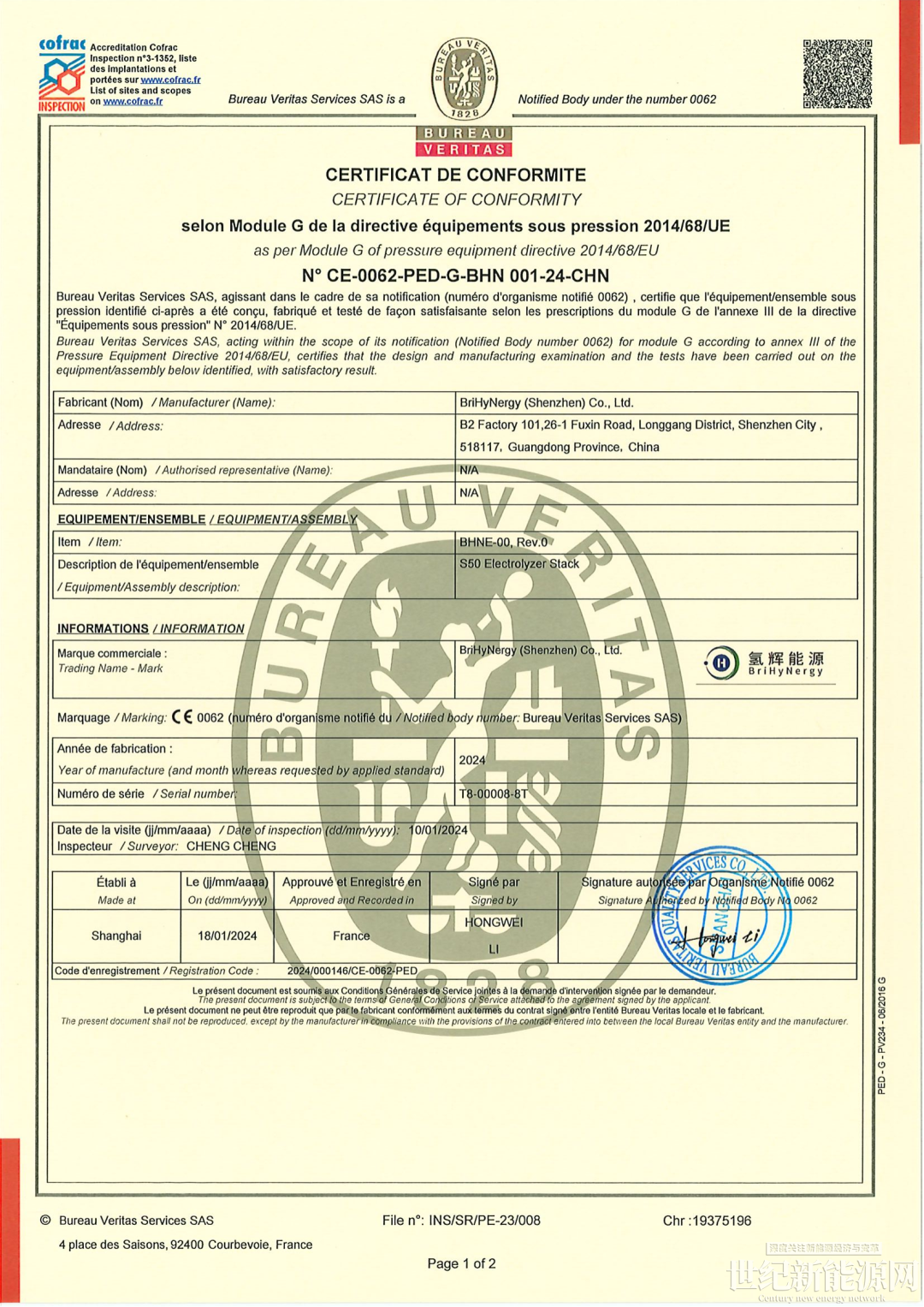 据悉,此次通过欧盟CE认证标志着氢辉能源BriLyzer-S50质子交换膜电解槽整体安全性能符合欧盟规范,安全技术能力达到全球行业先进水平;产品获得了进军欧洲地区市场的"签证",可为欧洲地区客户提供更安全、更优质、更可靠、更高效的PEM电解水制氢核心设备。