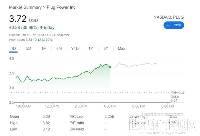 当地时间1月23日,作为美国乃至全球的“氢能源第一股”——普拉格能源(Plug Power)美股涨逾30%。