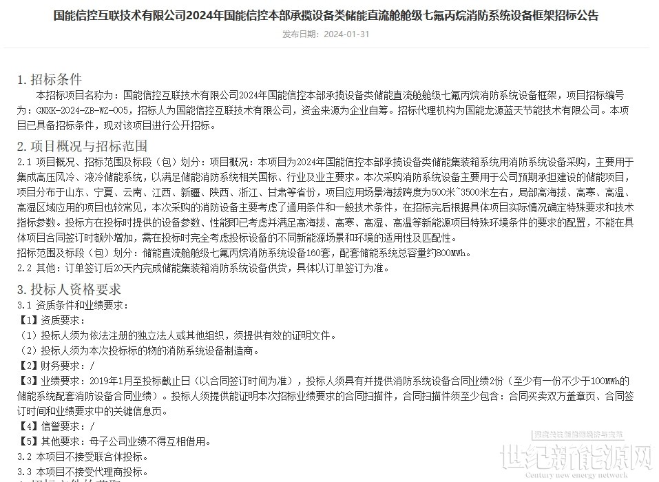 1月31日,国能信控互联技术有限公司2024年国能信控本部承揽设备类储能直流舱舱级七氟丙烷消防系统设备框架招标公告发布。本次招标储能直流舱舱级七氟丙烷消防系统设备160套,配套储能系统总容量约800MWh。