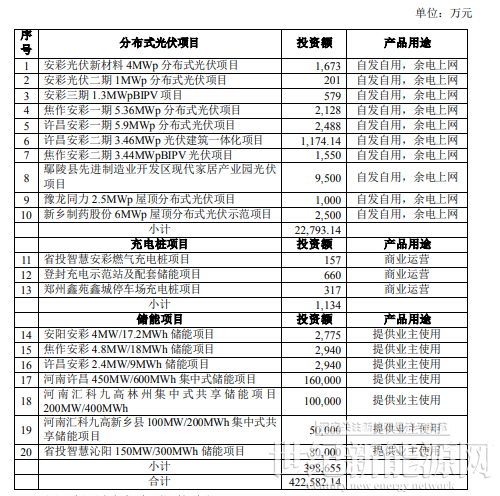 该投资计划包括,安彩光伏新材料 4MWp 分布式光伏项目、 安彩光伏二期 1MWp 分布式光伏项目等10个分布式光伏项目,3个充电桩项目以及7个储能项目。光伏项目拟投资2.28亿元,储能项目总计投资10亿元。