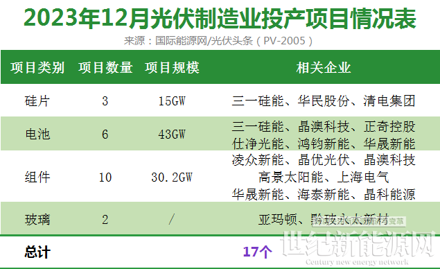 2023年12月以后,光伏制造业投产项目为17个,其中涉及硅片15GW、电池43GW、组件30.2GW以及两个光伏玻璃项目。