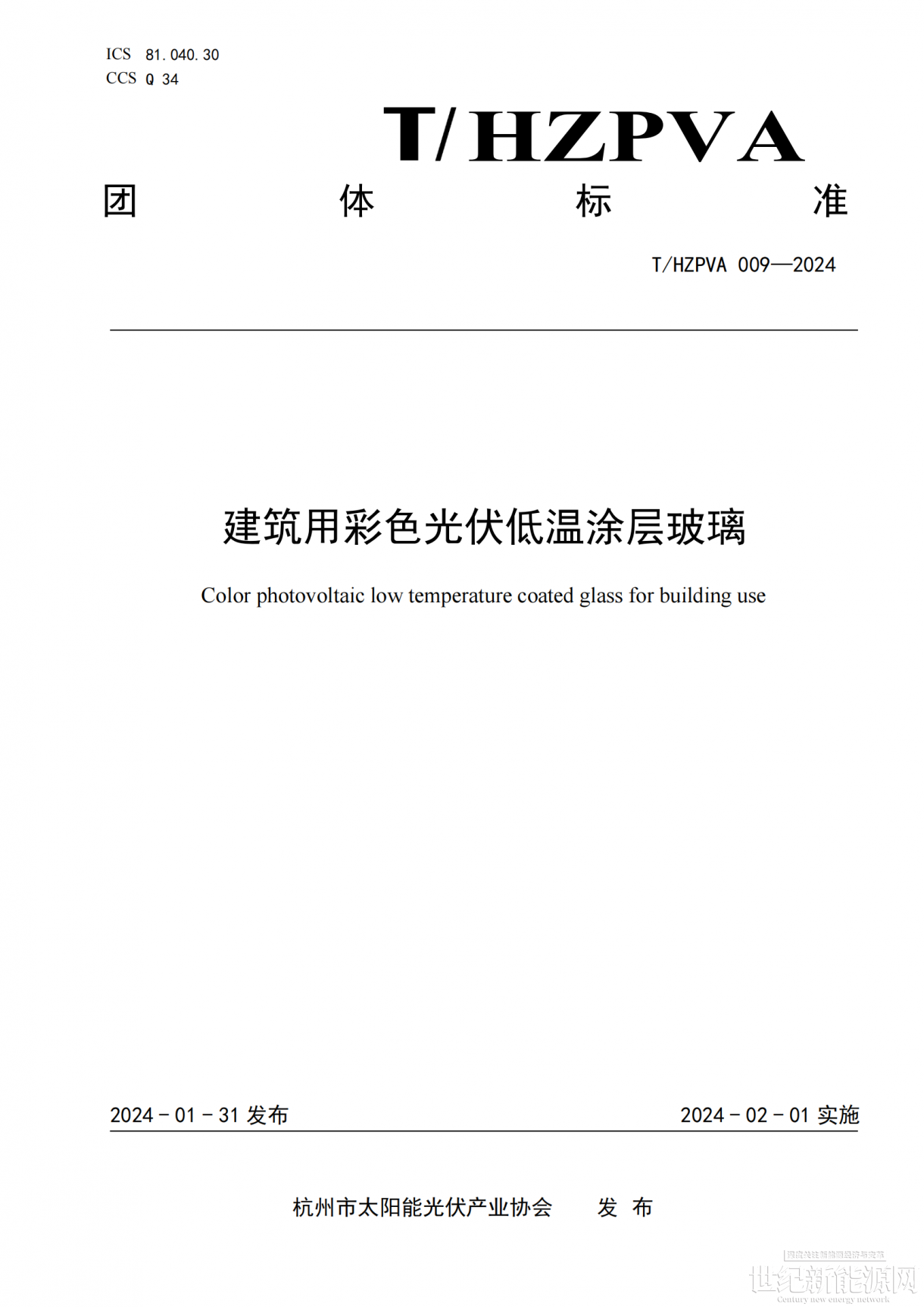根据《杭州市太阳能光伏产业协会团体标准制订程序》的相关规定,经专家论证立项、公开征求意见和组织专家审查会等相关程序,现将团体标准《建筑用彩色光伏低温涂层玻璃》(T/HZPVA 009—2024)予以发布,自2024年2月1日起实施。