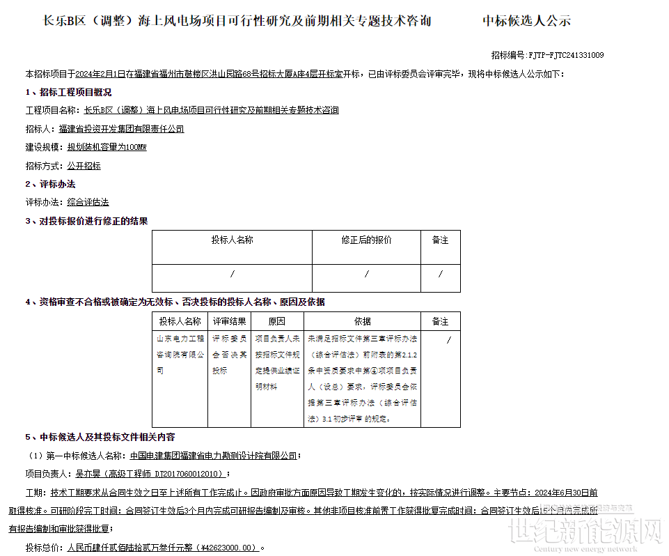 2月5日,龙源电力福建龙源新能源有限公司马祖岛外海上风电场项目(300MW)勘测设计、长乐外海I区(南)海上风电场项目、长乐B区(调整)海上风电场项目可行性研究及前期相关专题技术咨询中标候选人公示。