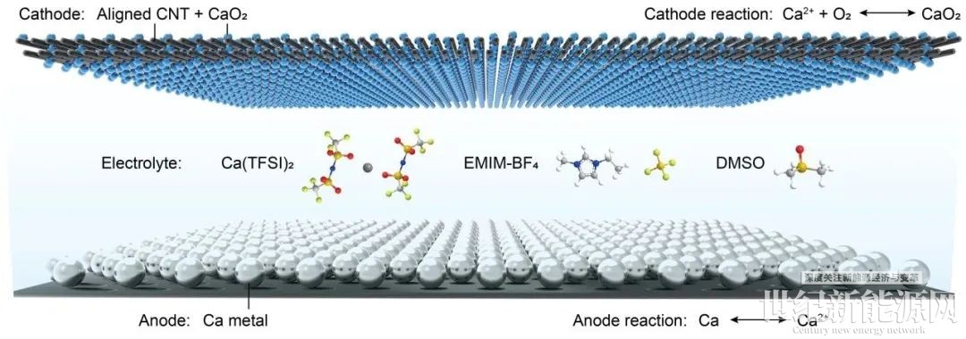 钙-氧气电池主要由三个部分构成:金属钙负极、碳纳米管空气正极和有机电解质。这种设计不仅优化了电池的性能和成本,还兼顾了环境的可持续性与柔性电子设备中的应用要求。金属钙负极不仅成本较低,还具有较高的理论容量,有利于实现全电池的高能量密度。