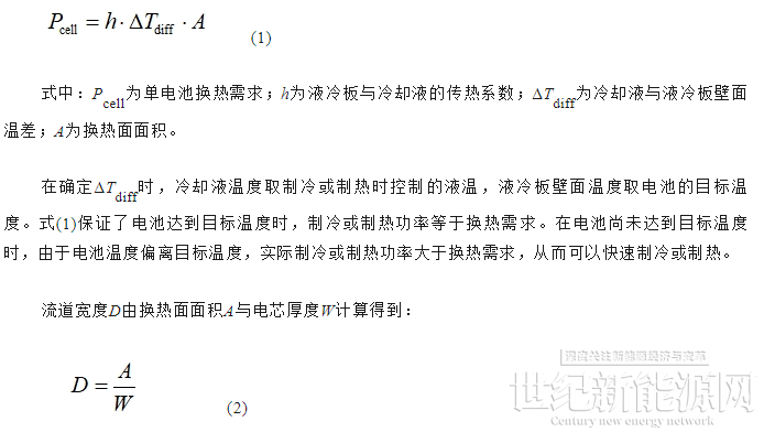 流道宽度设计从电池换热的需求入手。电池的换热需求包括散热与制热需求。散热需求为设计的最大充放电倍率下电池的发热功率,可由电池测试得到。制热需求在电池运行于低温环境下才会存在,电池在低温静置后可能需要经过加热才能达到可工作状态,所需的加热功率即为制热需求。制热需求也可由电池测试得到。