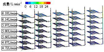 通过仿真,当下层4个三通水平方向出口孔径选择10 mm,上层3个三通水平方向出口孔径选择6~7 mm时,各电池包流量的差异变化不大;选取6~7 mm范围之外的参数时,各电池包流量的差异有所增加。因此上层3个三通水平方向出口孔径最终选择为7 mm。