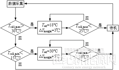 (2)制热:当电池最低温度Tcell_mmin<15 ℃时,启动制热,下发液温目标值Tset=30 ℃和回差ΔTmargin=5 ℃。制热至Tcell_min升至20 ℃时结束。