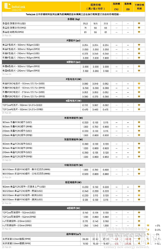 组件环节部分,人民币价格为中国内需报价,均价以当周交付出厂价格(不含内陆运输费用)为主。主要统计当期时间内交付的分布式、集中式项目,高低价依据市场状态反映二线厂家、或者部分前期项目价格为主;美元价格为非中国地区的海外价格,并以 FOB 报价不含关税,非人民币价格换算。