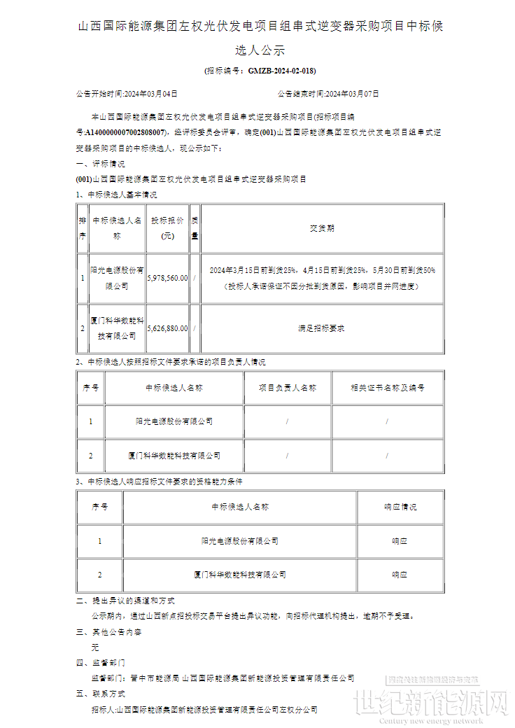 3月4日,山西国际能源集团左权光伏发电项目组串式逆变器采购项目中标候选人公示。