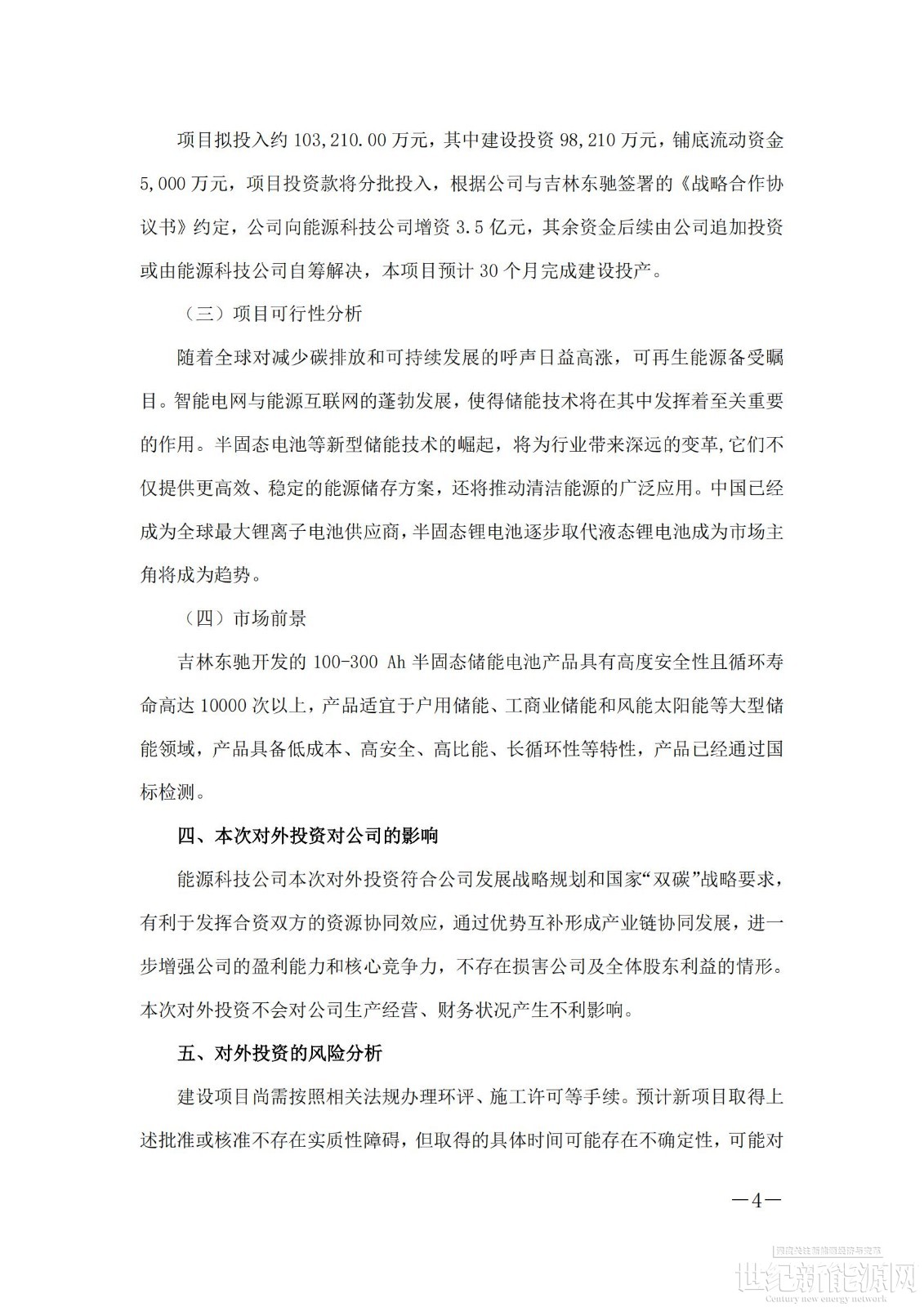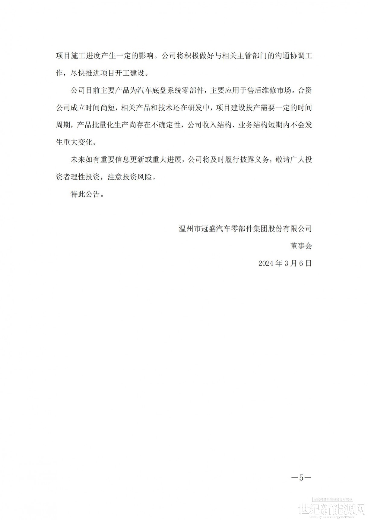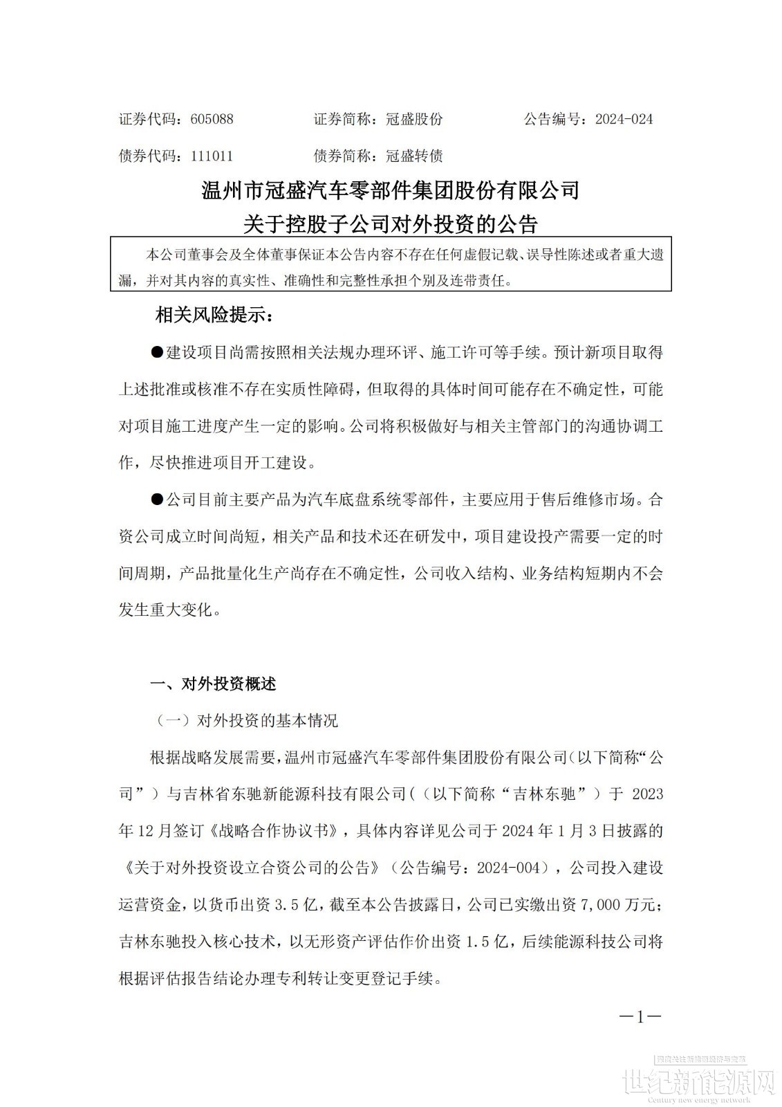 3月5日晚间,冠盛股份公告,合资公司浙江冠盛东驰能源科技有限公司(下称“能源科技公司”)拟在温州市投资新建半固态磷酸铁锂电池建设项目,项目总投资约10.3亿元,项目投资款将分批投入,根据公司与吉林东驰签署的《战略合作协议书》约定,公司向能源科技公司增资3.5亿元,其余资金后续由公司追加投资或由能源科技公司自筹解决。
