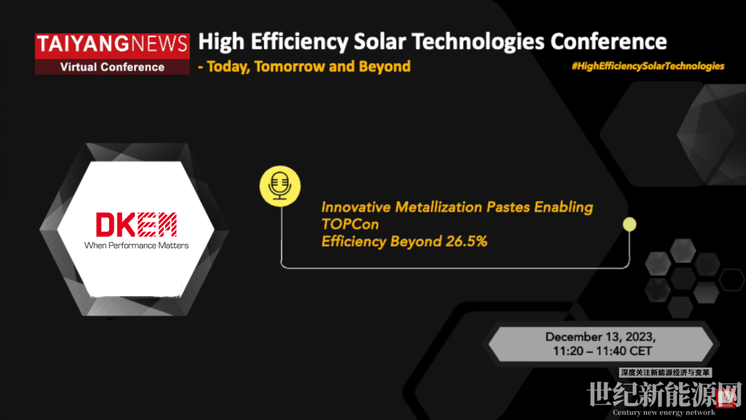 近日,由国际知名光伏媒体——德国TaiyangNews主办的High Efficiency Solar Technologies Conference系列在线研讨会中,帝科DKEM®受邀分享《Innovative metallization Pastes Enabling TOPCon Efficiency Beyond 26.5%》的专题报告,详细阐述了基于新型激光增强烧结工艺的TOPCon电池提效降本之路,以及金属化浆料扮演的更加重要的角色。