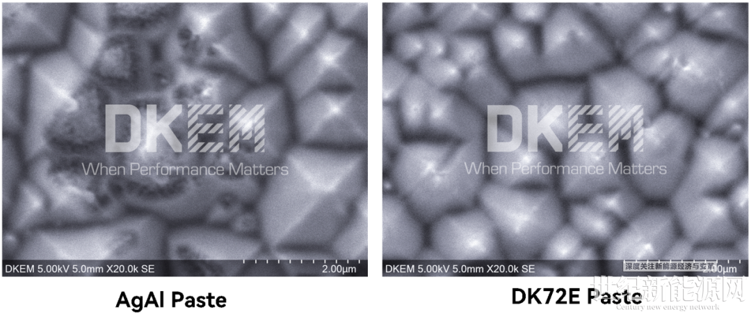 帝科DKEM®基于全新无机/有机架构创新开发的DK72E专用导电浆料,通过金属复合与欧姆接触的解耦,在第一阶段的量产实践中实现了0.3~0.5%的效率提升。该浆料通过对玻璃流动及刻蚀能力的精准调控,在烧结及激光处理过程中,大幅降低了对钝化层的破坏;同时,在有限的刻蚀通道内,形成高质量的银硅合金接触位点。