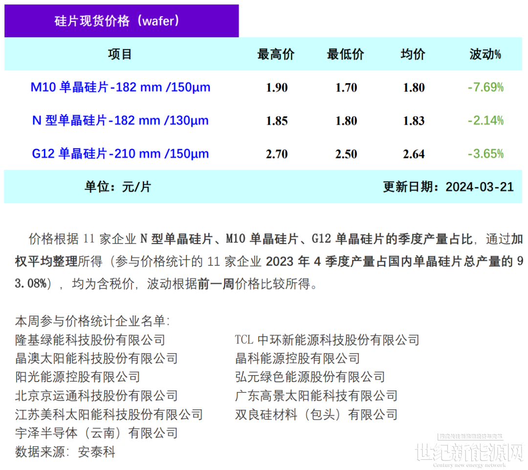 本周成交情况混乱,头部企业有挺价趋势。M10单晶硅片(182 mm /150μm)成交均价降至1.80元/片,周环比跌幅为7.69%;N型单晶硅片(182 mm /130μm/256mm)成交均价降至1.83元/片,周环比跌幅为2.14%;G12单晶硅片(210 mm/150μm)成交均价降至2.64元/片,周环比跌幅为3.65%。