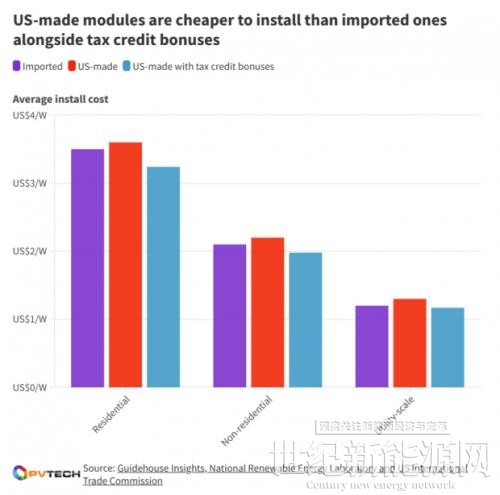 下图显示了SEMA所称的美国制造组件与海外进口组件在多个太阳能领域的"有效"安装成本。虽然从表面上看,进口组件仍然比美国制造的组件便宜,但SEMA指出,如果与《通货膨胀削减法案》中提供的税收减免等支持性政策一起考虑,安装美国制造的组件实际上比使用其他地方制造的组件要便宜一些。