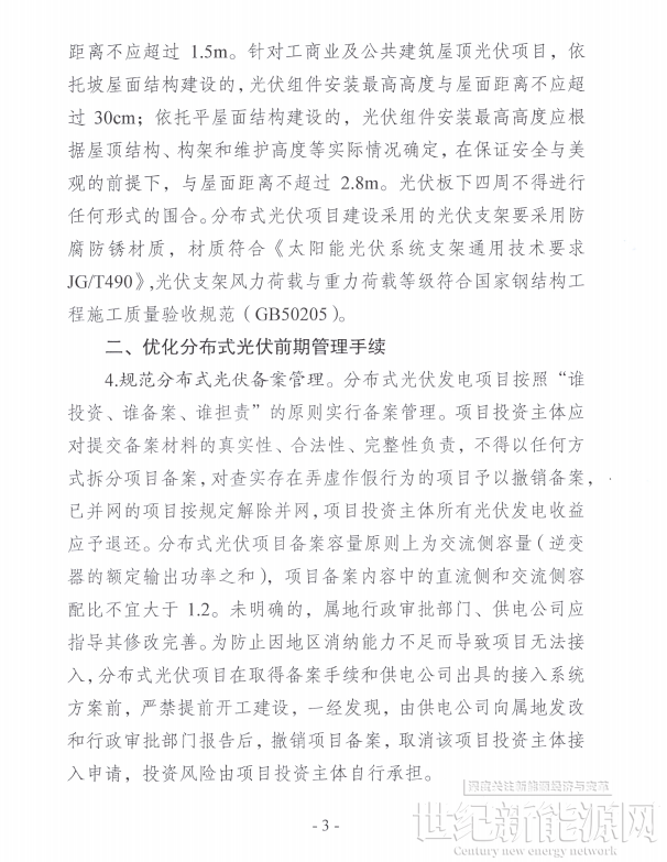 分布式光伏应依托合法建筑物及设施,由相关部门依据相关规定审批,不得在违建建筑物或设施上建设。对于已认定违建的在途分布式光伏项目不予并网。违建建筑设施上的光伏在拆迁时不计入赔偿补偿范围。另外,分布式光伏发电项目按照“谁投资、谁备案、谁担责”的原则实行备案管理。在取得备案手续和供电公司出具的接入系统方案前,严禁提前开工建设。