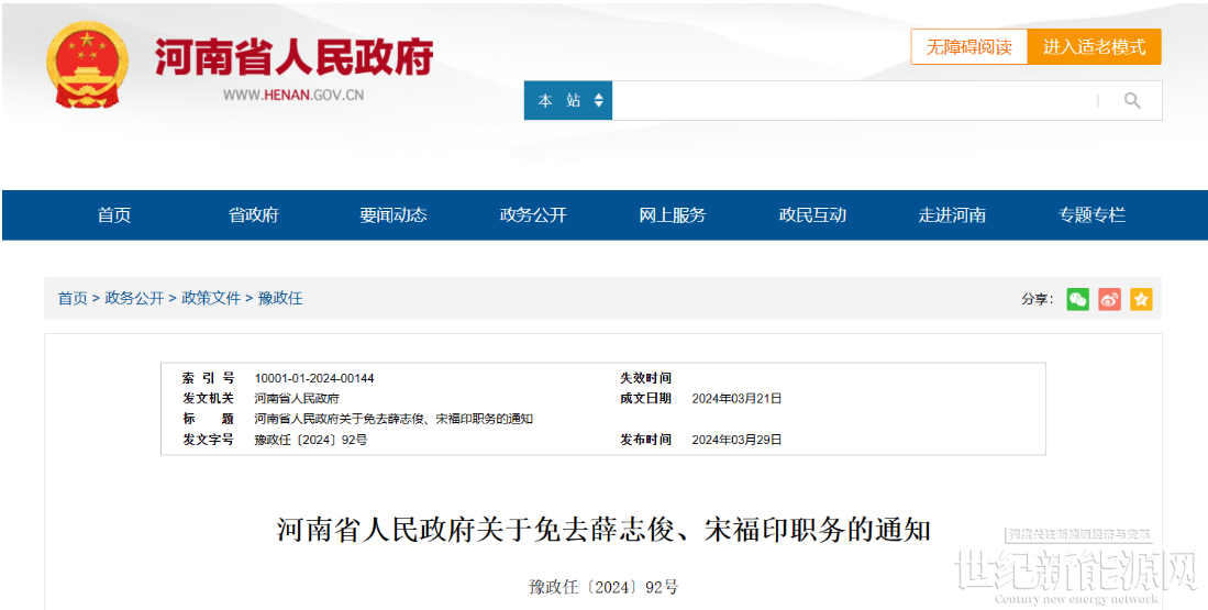 河南省人民政府网站3月29日消息,河南省人民政府决定:免去薛志俊的河南能源集团有限公司副董事长职务;免去宋福印的河南能源集团有限公司副总经理职务。