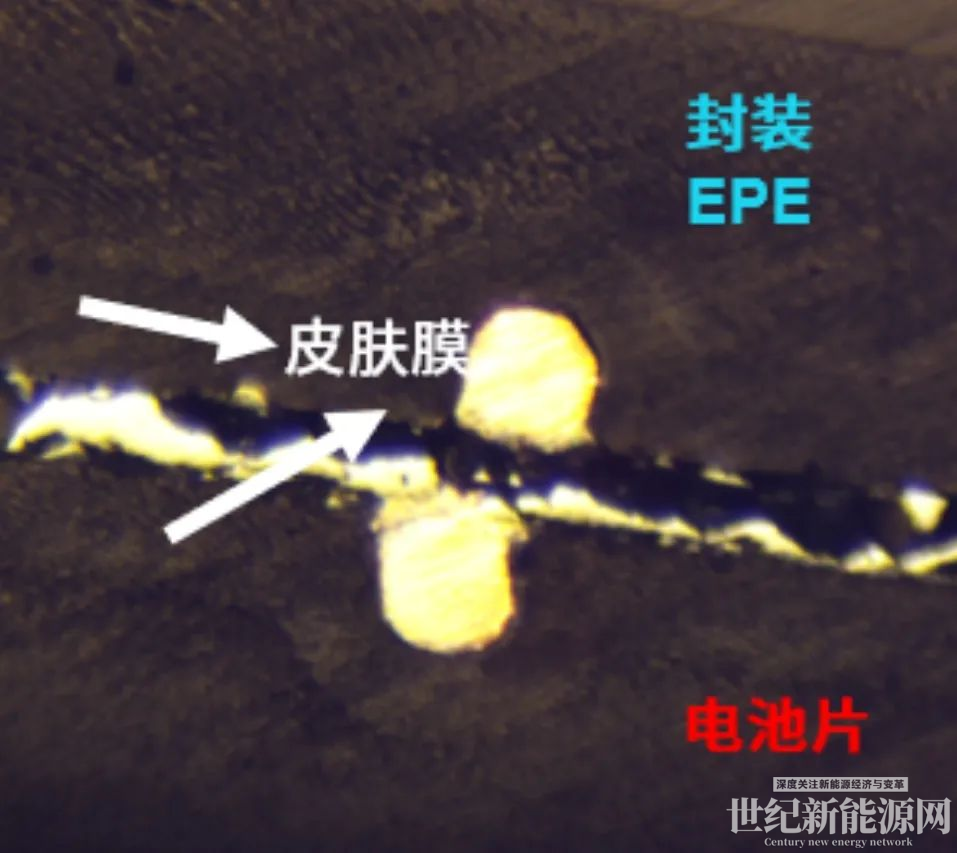 针对0BB技术要求,百佳年代推出“皮肤膜+低克重EPE胶膜”封装技术,采用高粘结改性树脂,胶膜层压后流动性较低,胶膜粘结层硬度较高,在提高胶膜与电池片粘结力的同时,可实现层压过程对焊带的完美包裹,有效提高光伏组件制程良率和产品稳定性。