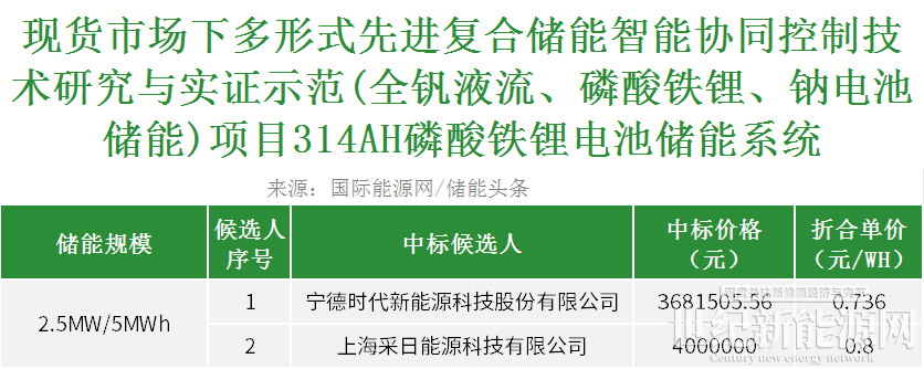 4月10日,现货市场下多形式先进复合储能智能协同控制技术研究与实证示范(全钒液流、磷酸铁锂、钠电池储能)项目314AH磷酸铁锂电池储能系统中标候选人公示。根据候选人公告,第一中标候选人为宁德时代新能源科技股份有限公司,中标价格为3681505.56元,折合单价0.736元/Wh;第二中标候选人为上海采日能源科技有限公司,中标价格为4000000元,折合单价0.8元/Wh。