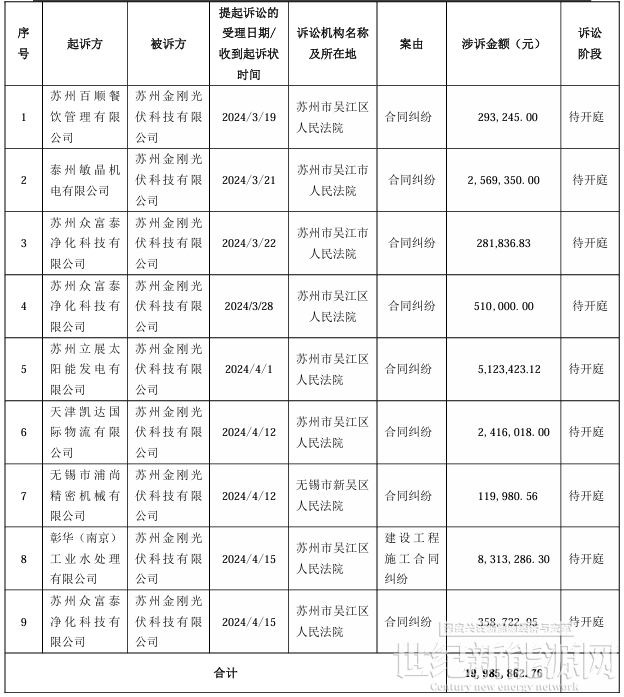 4月15日,金刚光伏披露关于累计诉讼、仲裁案件情况的公告。
