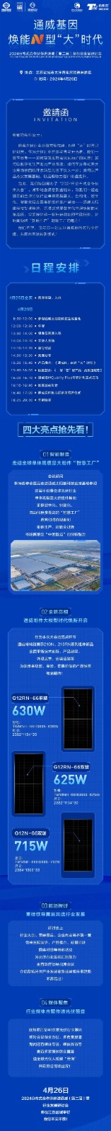 面对跌宕起伏的市场环境和多样化多层级的市场需求,如何携手穿越周期,共赢发展。4月26日,通威将在江苏盐城举办2024分布式合作伙伴进通威(第二届)暨行业发展研讨会。活动期间,行业重磅嘉宾分享交流,共谋行业发展;走进通威太阳能科技盐城组件生产基地,近距离感受智造魅力;全面展示通威G12RN和G12N系列组件新品,解读焕能N型“大”时代的通威核心技术。