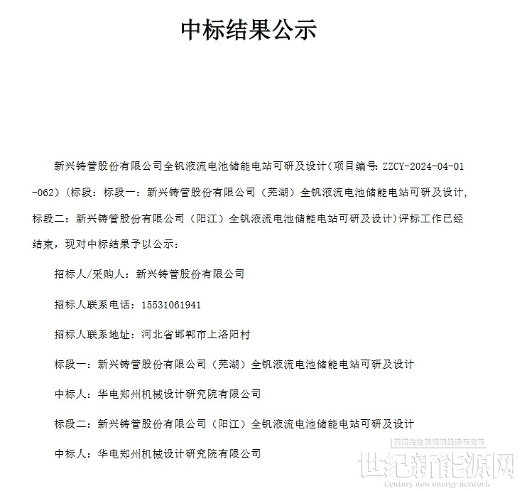 5月12日,新兴铸管股份有限公司全钒液流电池储能电站可研及设计]中标结果公示。公告显示,华电郑州机械设计研究院有限公司中标标段一:新兴铸管股份有限公司(芜湖)全钒液流电池储能电站可研及设计;标段二:新兴铸管股份有限公司(阳江)全钒液流电池储能电站可研及设计。