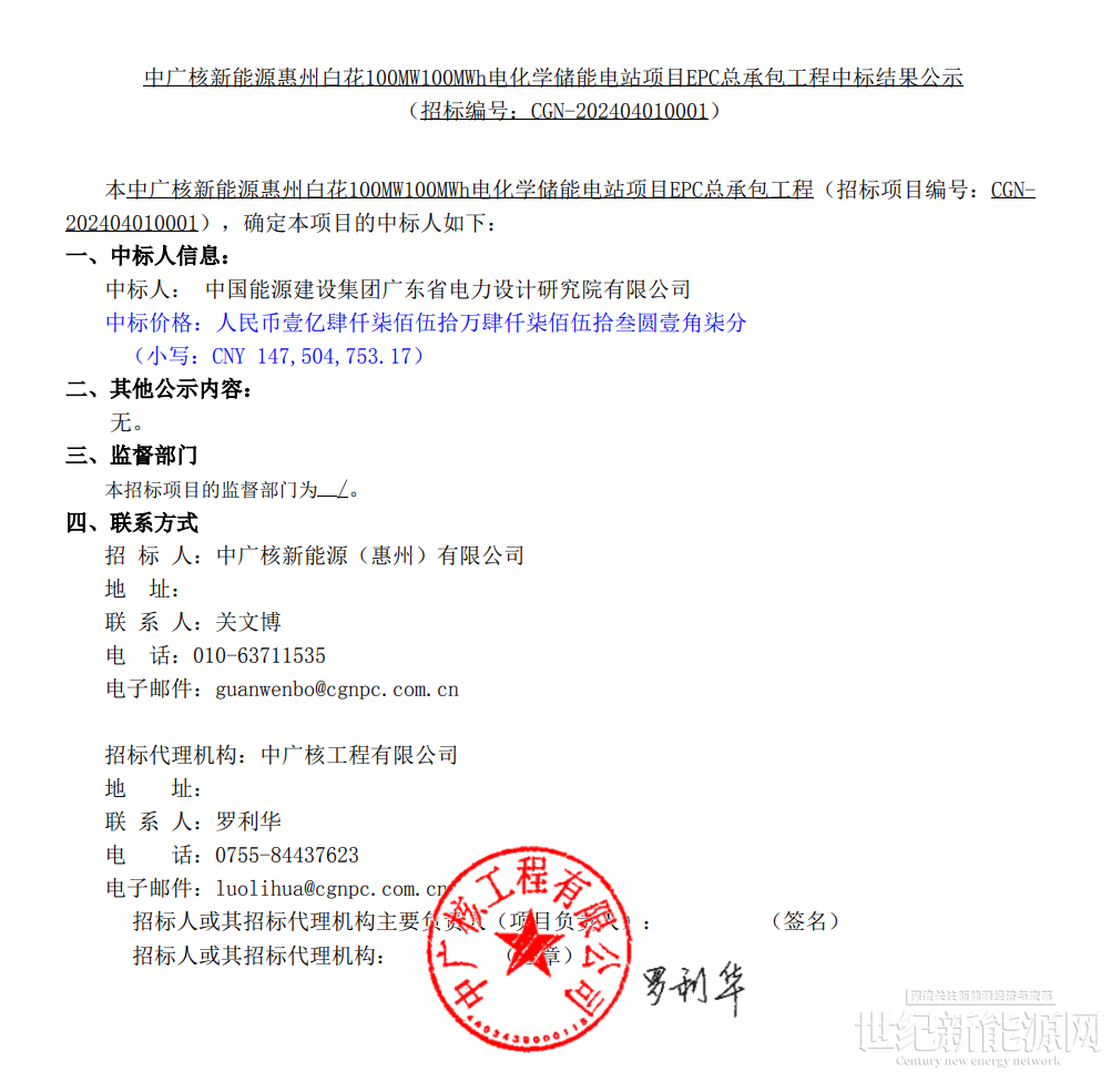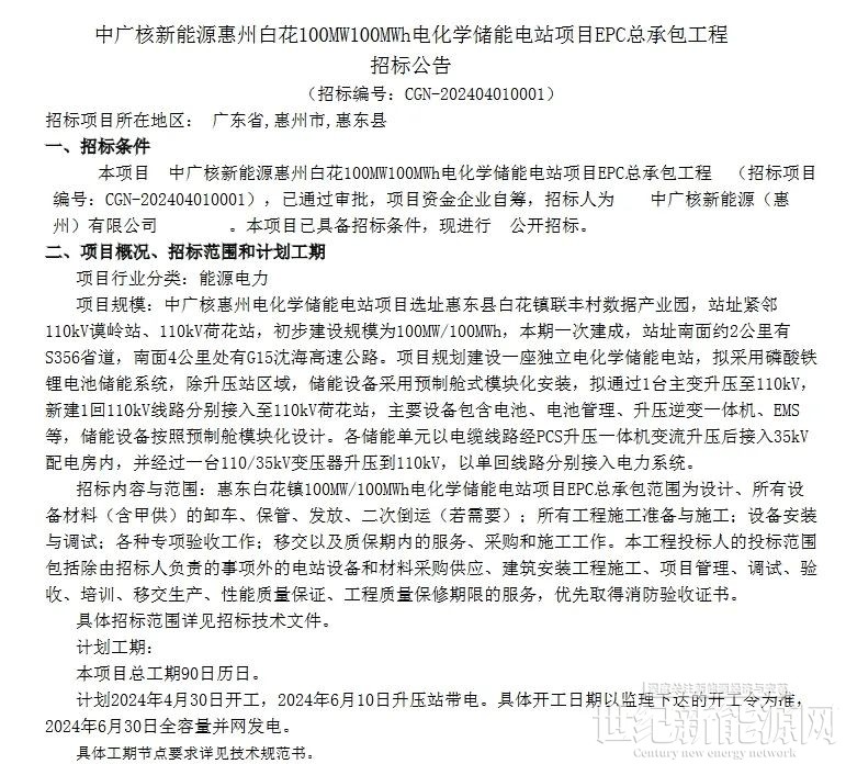 5月23日,中广核新能源发布惠州白花100MW/100MWh电化学储能电站项目EPC总承包工程中标结果。