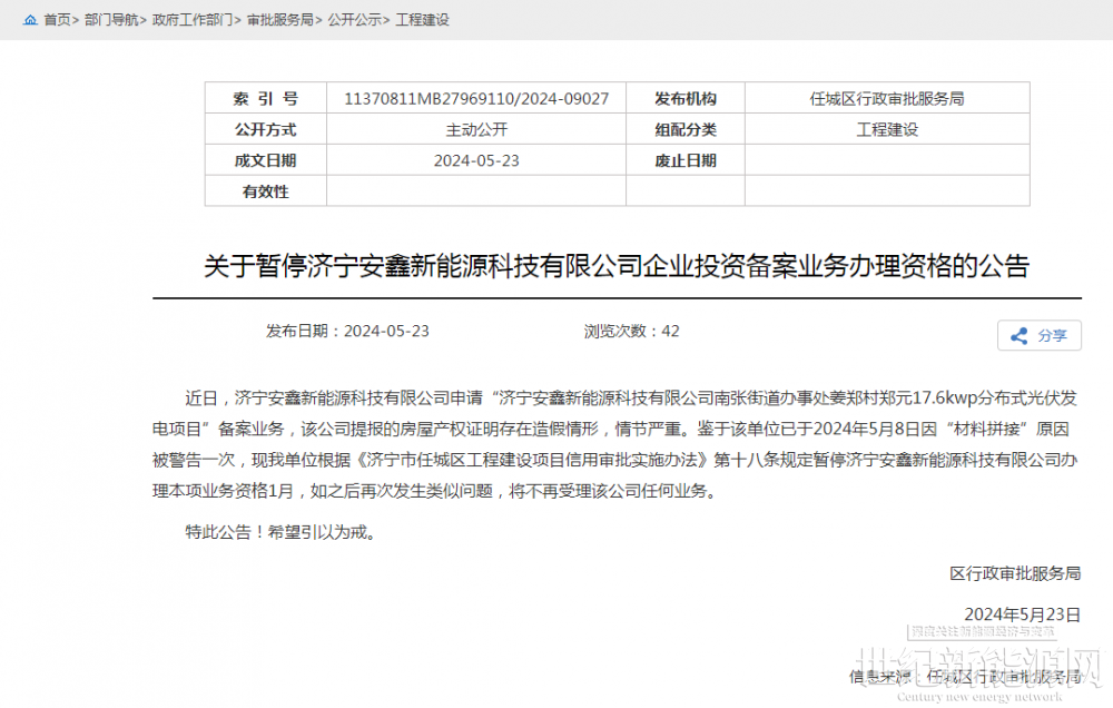 公告指出,近日,济宁安鑫新能源科技有限公司申请“济宁安鑫新能源科技有限公司南张街道办事处姜郑村郑元17.6kwp分布式光伏发电项目”备案业务,该公司提报的房屋产权证明存在造假情形,情节严重。鉴于该单位已于2024年5月8日因“材料拼接”原因被警告一次,现任城区行政审批服务局根据《济宁市任城区工程建设项目信用审批实施办法》第十八条规定暂停济宁安鑫新能源科技有限公司办理本项业务资格1月,如之后再次发生类似问题,将不再受理该公司任何业务。