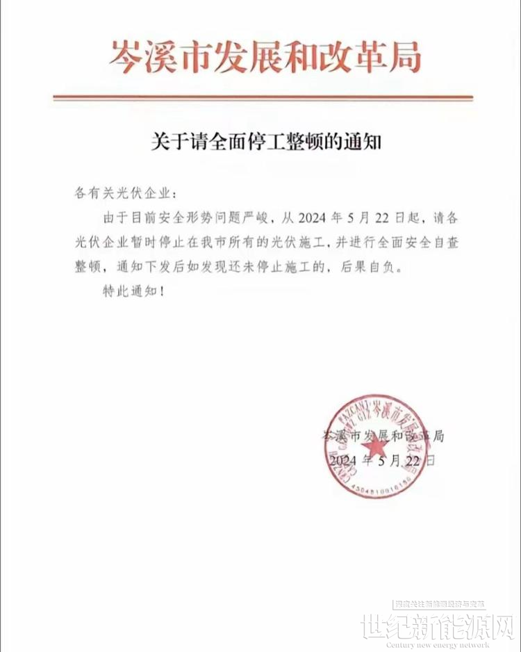近期,广西岑溪市发改局发布了一条“关于请全面停工整顿的通知”,表示由于目前安全形势问题严峻,从2024年5月22日起,请各光伏企业暂时停止在岑溪市所有的光伏施工,并进行全面安全自查整顿,通知下发后如发现还未停止施工的,后果自负。