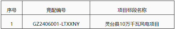 公告指出,本次共有风电10万千瓦规划规模,选址区域具体为灵台县具备风资源开发条件的邵寨镇或者朝那镇及周边,单机容量不低于4兆瓦,根据项目选址区域实际情况划分1个项目进行竞配。