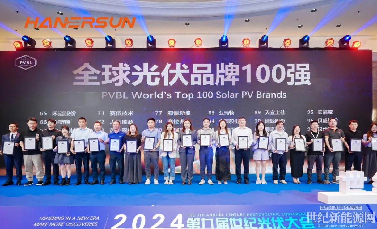 6月11日,由世纪新能源网、光伏品牌实验室Photovoltaic Brand Lab(PVBL)联合主办的CPC2024第九届世纪光伏大会暨PVBL2024第十二届全球光伏品牌榜发布会在上海举行。 汉伏能源凭借稳中有进的发展态势入选2024年度光伏品牌100强榜单,并荣获“全球光储行业成长最快企业奖”及“全球最佳光伏品牌传播奖”,彰显了公司在行业中的技术领先地位和品牌实力。