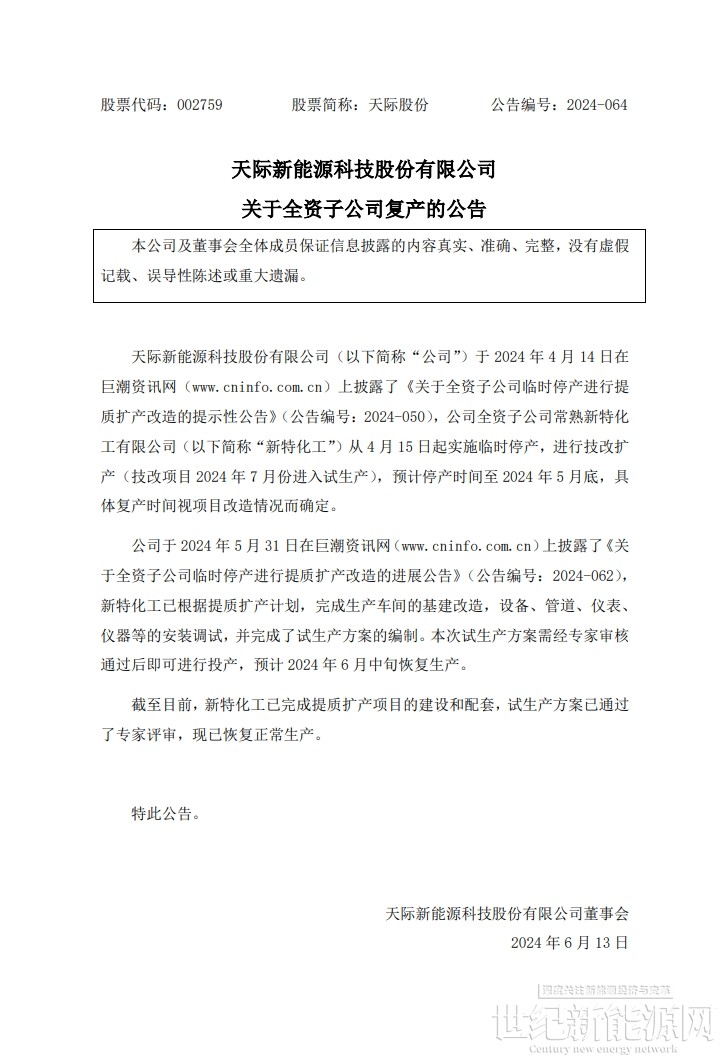 公告称,新特化工已根据提质扩产计划,完成生产车间的基建改造,设备、管道、仪表、仪器等的安装调试,并完成了试生产方案的编制。本次试生产方案需经专家审核通过后即可进行投产,预计2024年6月中旬恢复生产。