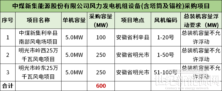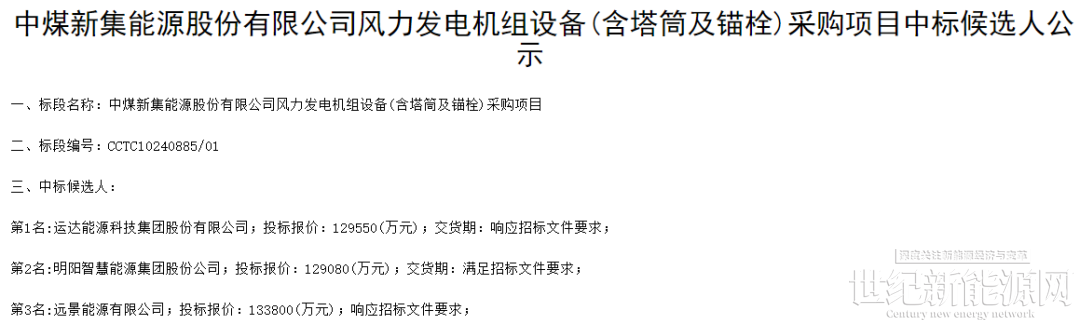 6月19日,中煤新集能源股份有限公司风力发电机组设备(含塔筒及锚栓)采购项目中标候选人公示,运达股份、明阳智能、远景能源3家整机商入选。
